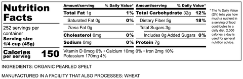 Maine Grains Pearled Farro is made from spelt berries that have passed through our pearler (‘farro perlato’, as the Italians would call it) which removes a small portion of the seed’s outer bran layer. This dramatically reduces cooking time while retaining the rich flavor and nutrition that make whole grains so desirable. Use as you would rice as an addition to soups and salads or a hearty base to homemade grain bowls.